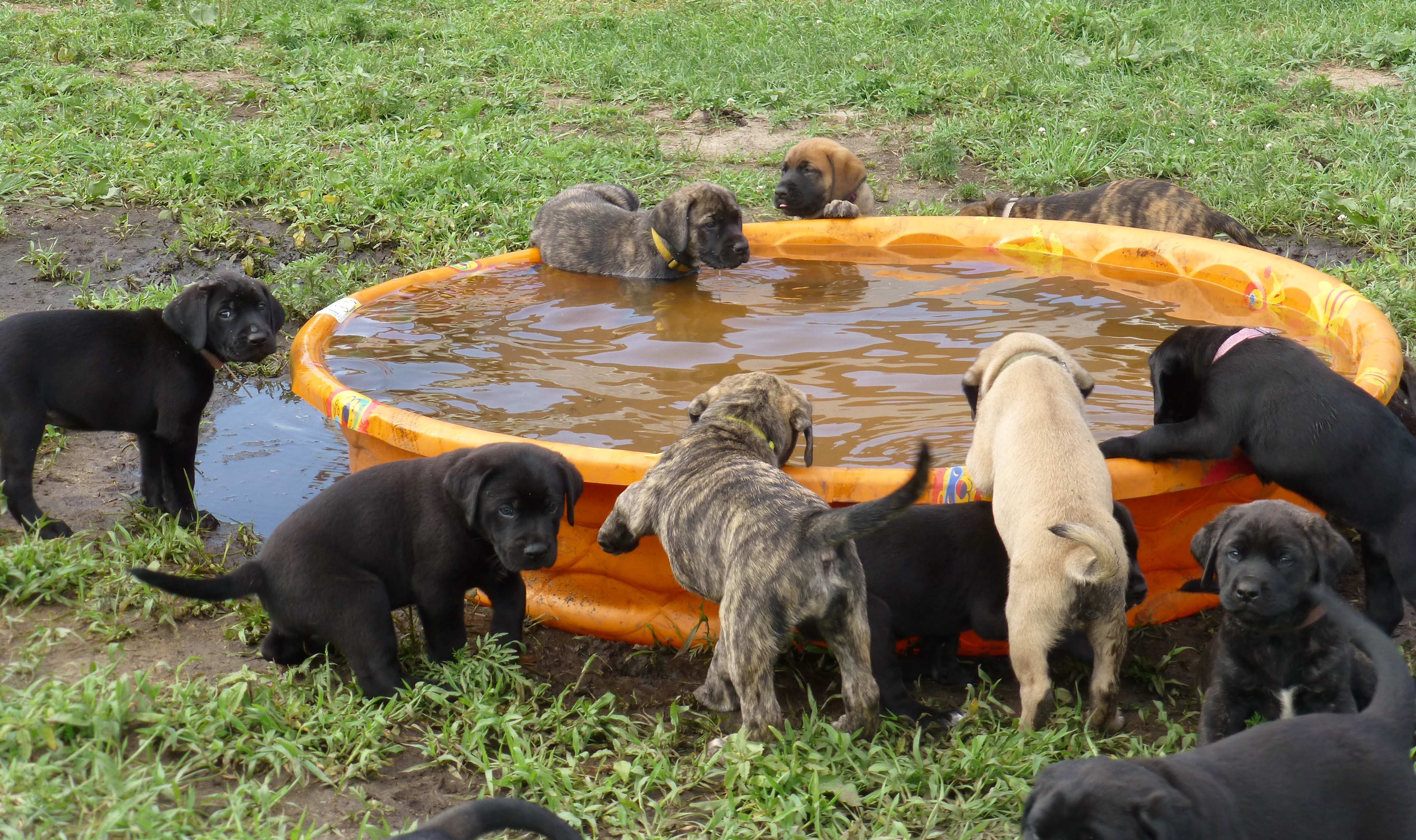 We don't limit our puppies exercise, neither do we force them - we let puppies be puppies which means they are free to play or rest when they want. They play, sleep and eat on and off throughout the day. Our puppies have access to both indoor and outdoor play areas. Outdoors they are mostly on grass with plenty of things to explore. As puppies grow they play for longer and harder periods of time (and rougher with each other) before resting. One of the (many) things that I love about our Mastadors is that they seem to naturally know know when they have had enough and its time to rest.